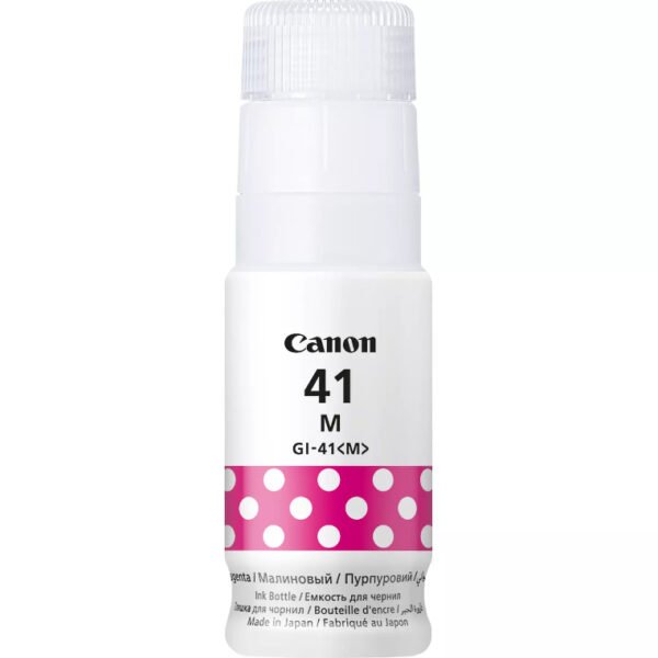 For those with heavy color printing needs, the Canon GI-41 Magenta Ink Bottle provides vibrant, consistent magenta tones. With a page yield of up to 7,700 pages, it is ideal for producing high-quality color documents, marketing materials, and photos. Compatible with Canon MegaTank printers, this ink bottle ensures easy, mess-free refilling and reliable performance. Whether you’re printing creative projects or colorful reports, the GI-41 Magenta Ink Bottle offers exceptional value and long-lasting, professional-quality results.